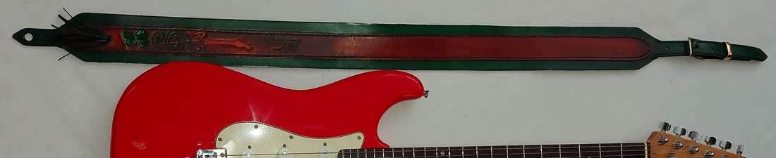 These guitar straps below are an example of the work that I do. Most have been hand tooled and others have been embossed. All have been hand made, hand dyed, hand stitched and finished. All are unique.